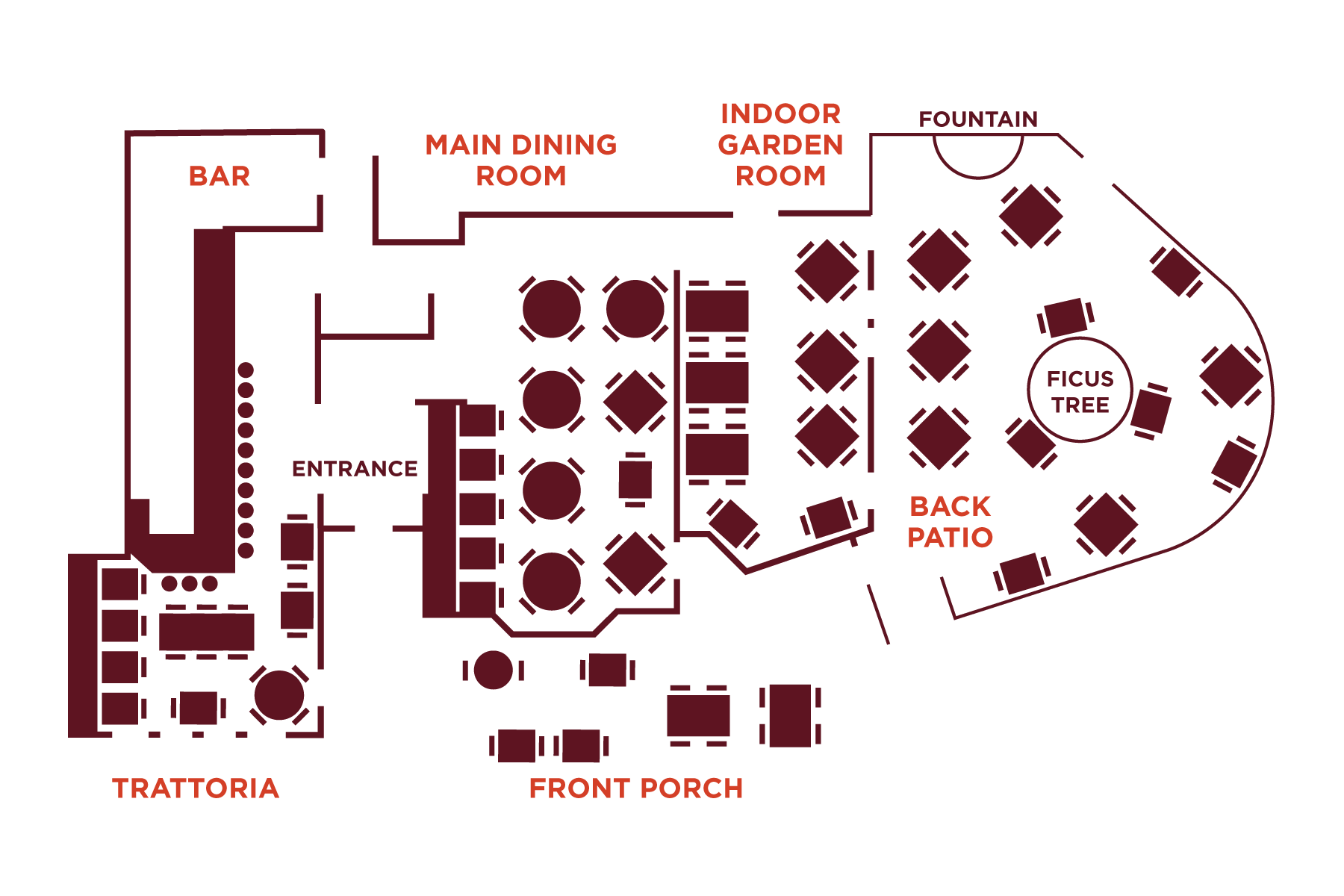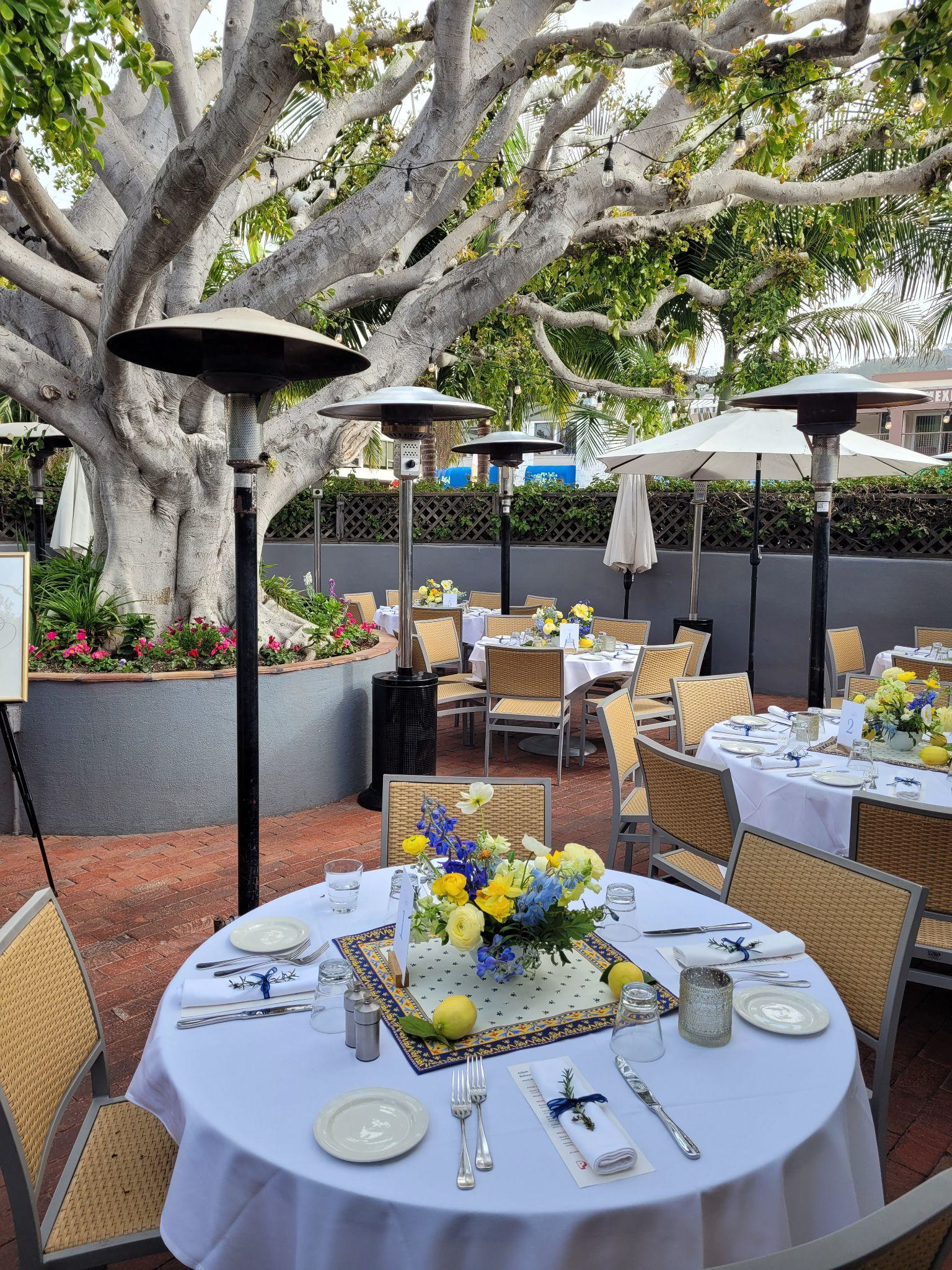 Covered by our landmark Ficus tree, our open air patio is ideal for rehearsal dinners, small wedding ceremonies and receptions.