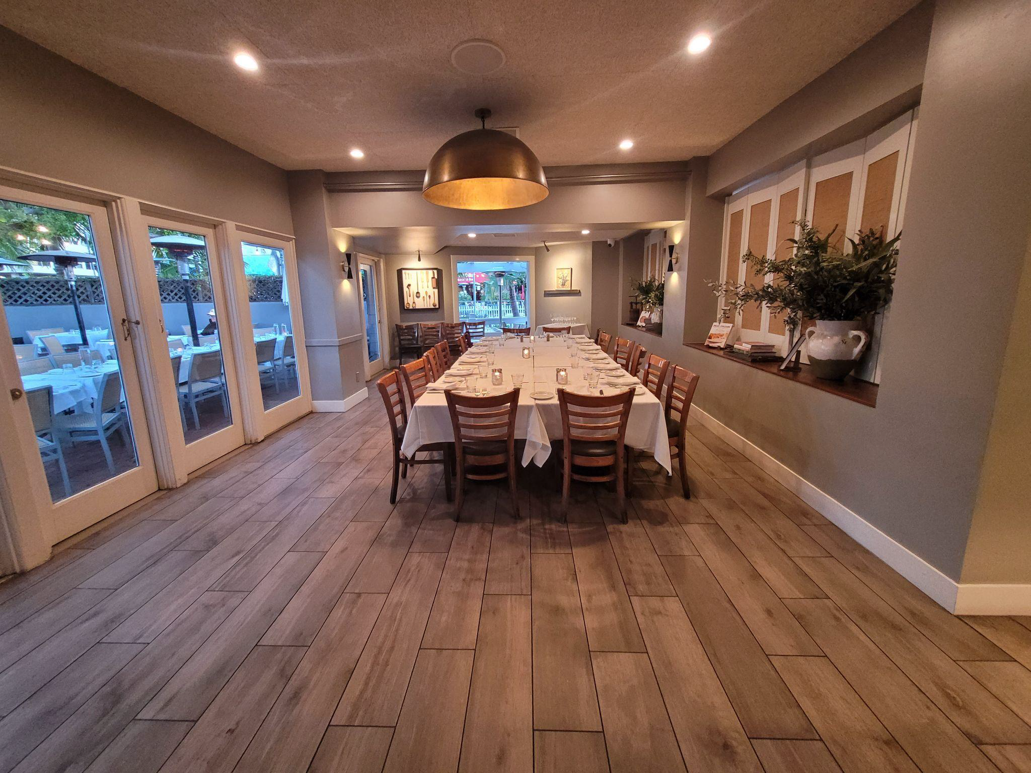 Our front patio is an inviting open-air space for up to 20 guests, ideal for cocktail receptions and standing gatherings. Host your event here with bites and drinks, or transition seamlessly into one of our private dining spaces.