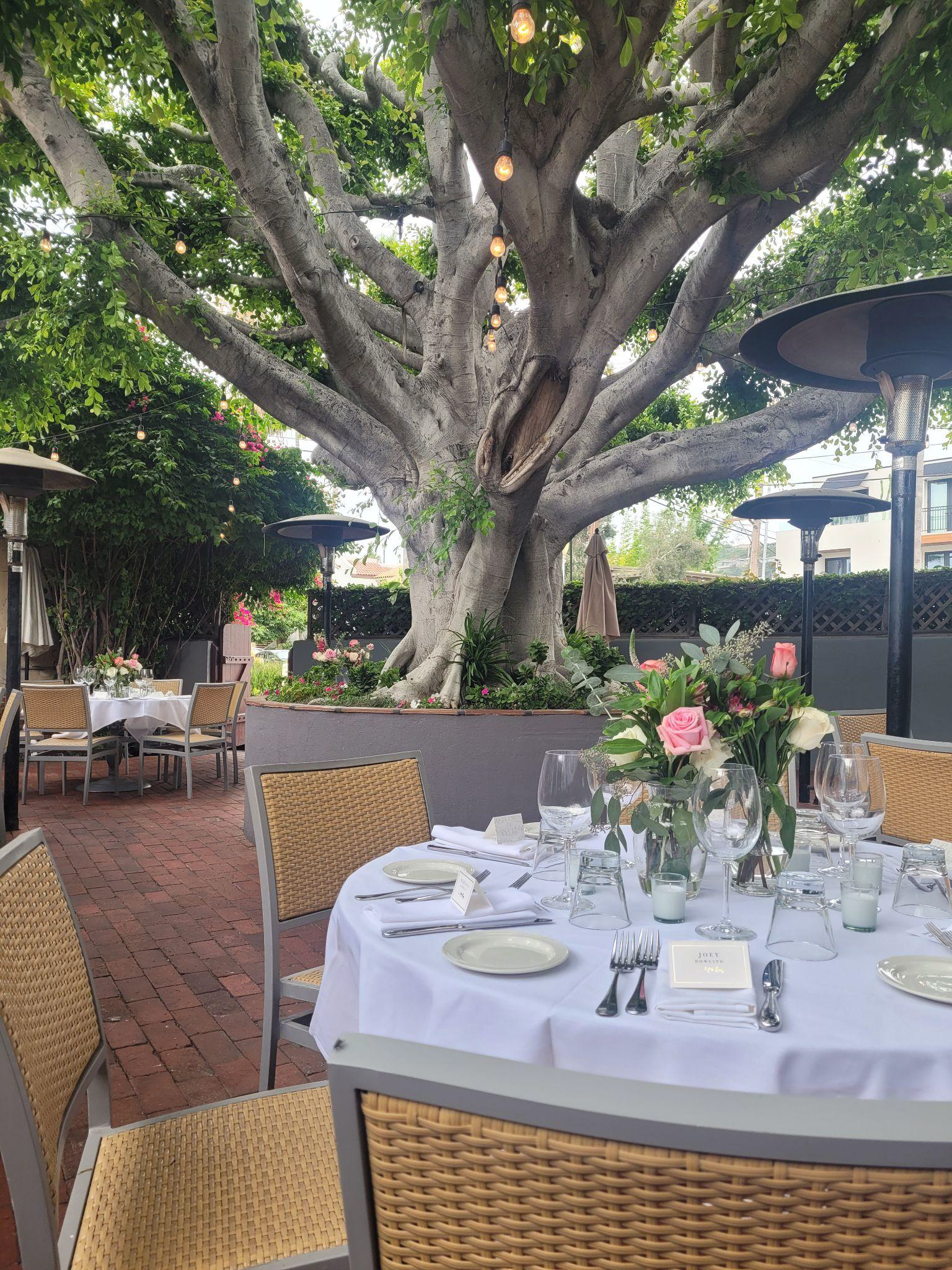 During the day, the patio is bright and beautiful. At night, the Ficus tree lights up to create dazzling ambiance. The patio is heated, but not covered.
